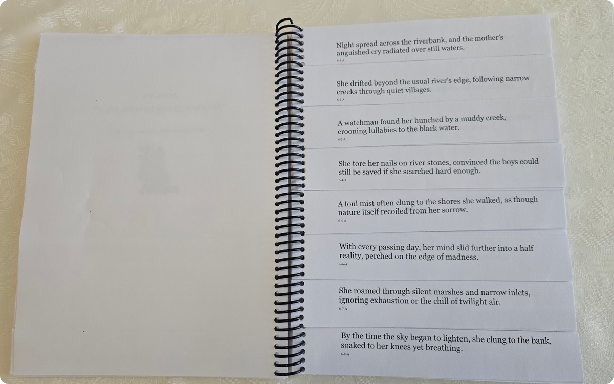 No publisher would take on a project that required this level of physical assembly, so Branching Plot Books stepped in. Every copy is built by hand, with each page torn into eight sections, allowing the text to shift. No two books are identical, and no two readers will experience Isabel the same way. How you read, which lines you choose to flip, and the secrets you discover all create a personal version of the story. Millions of readers can share the same book, yet no two will walk away with the same understanding.